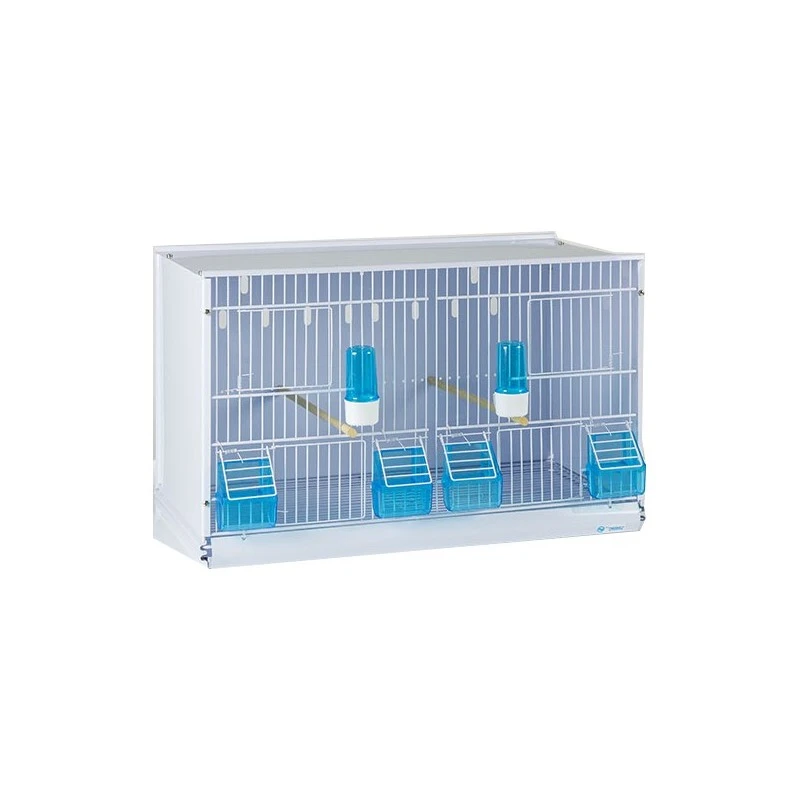 Livrée avec 3 grilles de fond de cage, 12 mangeoires italiennes bleues, 6 abreuvoirs anti-algues bleus, 6 perchoirs en bois et un support sur roulettes.